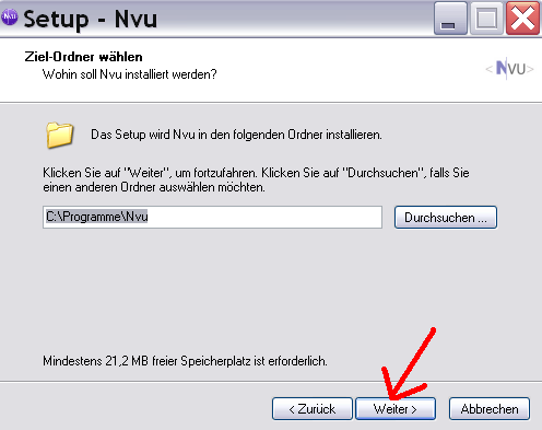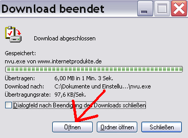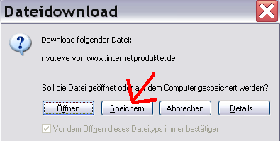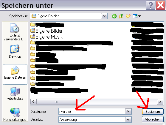Wählen Sie einen passenden Dateinamen, z.B. "nvu.exe" im mit dem Pfeil markierten Feld und klicken Sie anschliessend auf SPEICHERN.