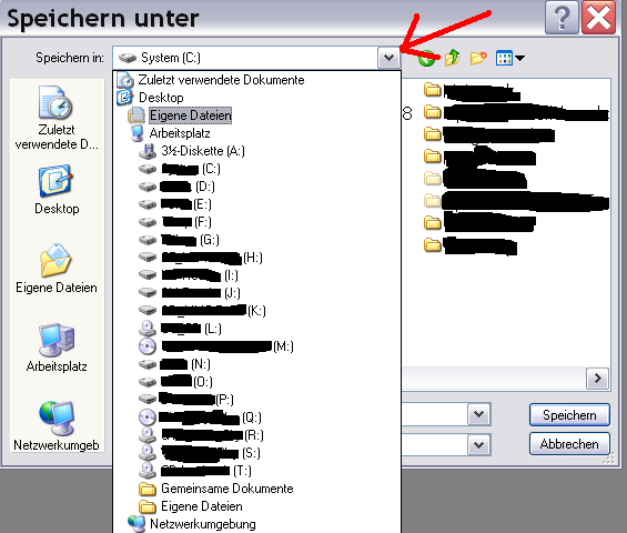 Klicken Sie anschliessend auf das mit dem roten Pfeil markierten Feld und wählen Sie dort den Eintrag "Eigene Dateien" aus.