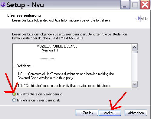 Klicken Sie auf "Ich akzeptiere die Vereinbarungen" und klicken Sie auf WEITER.