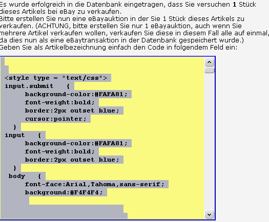 Kopieren Sie sich dort aus dem gelben Textfeld den Quelltext in die Zwischenablage (klicken Sie dazu in das Textfeld und drücken Sie zuerst die Tasten STRG und A auf ihrer Tastatur gleichzeitig und anschliessend die Tasten STRG und C) und wechseln Sie wieder zum Editor.